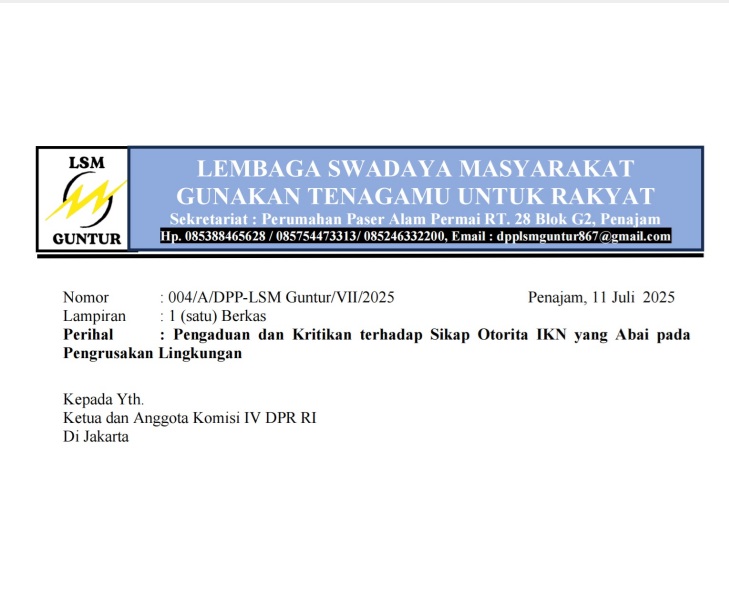 Dalam surat bernomor : 004/A/DPP-LSM Guntur/VII/2025, perihal Pengaduan dan Kritikan terhadap Sikap Otorita IKN yang Abai pada Pengrusakan Lingkungan, tertanggal 11 Juli 2025 itu, LSM Guntur menyatakan beberapa hal diantaranya adalah terkait sikap tidak memberikan respon yang memadai atas aktivitas tambang ilegal. berikut petikan surat dimaksud :