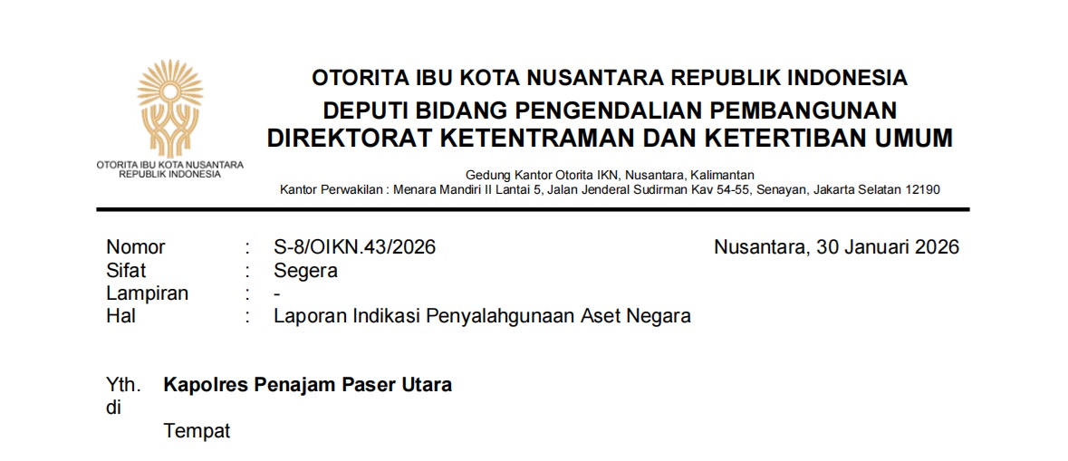 Laporan tersebut tertuang dalam surat bernomor S-8/OIKN.43/2026 perihal Laporan Indikasi Penyalahgunaan Aset Negara, tertanggal 30 Januari 2026.